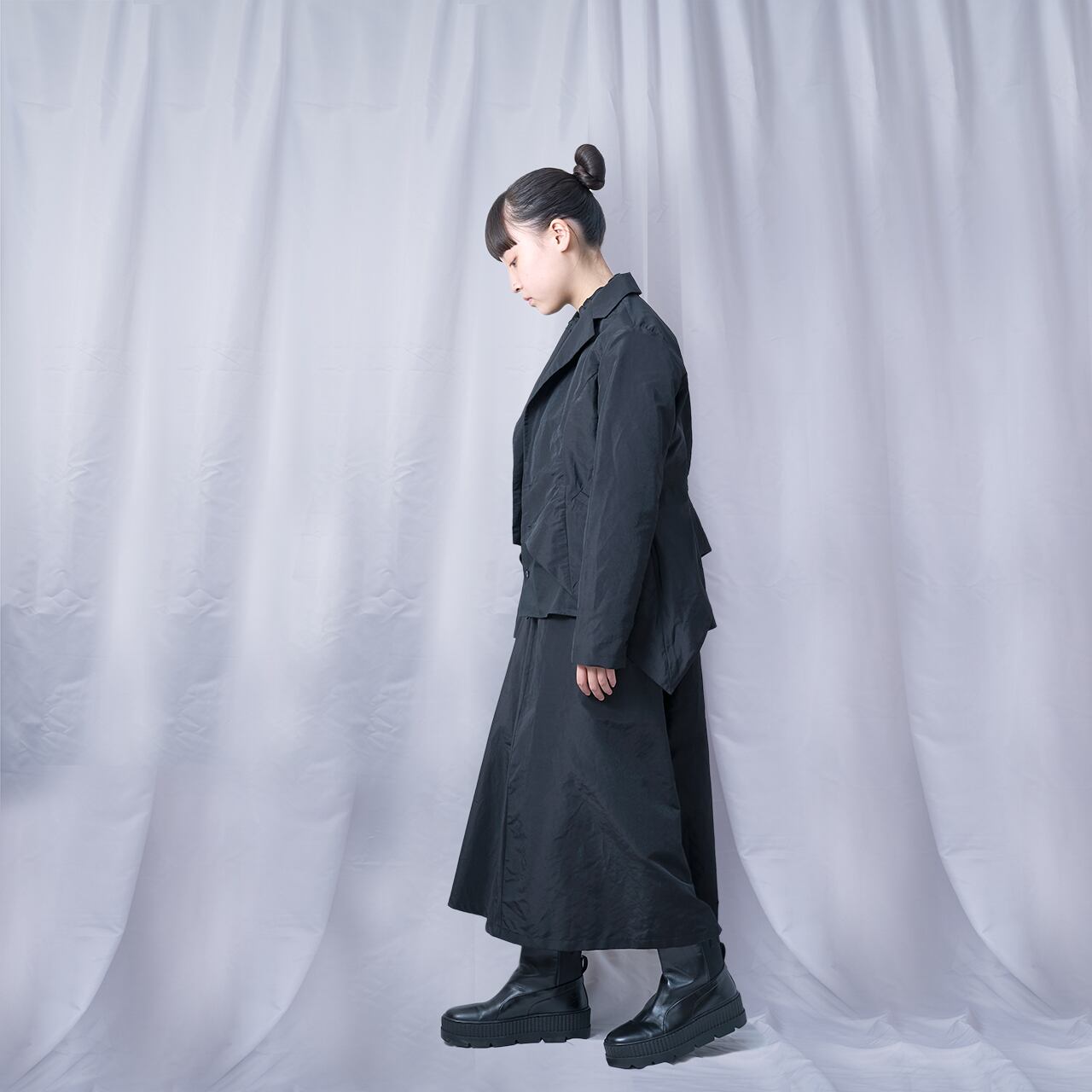 モーニングをイメージした裾、前後とも共脇長裾ラインにしたことでインナーを見せたり、ボリュームのあるボトムと合わせてもスッキリとした印象を与えます。抜け感はあるのにどこかきちんとしたデザインに仕上げました。